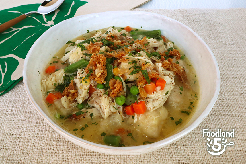 “Shredded chicken, sweet garden vegetables, and soft, fluffy dumplings in a savory, creamy broth – this soup is like a hug in a bowl.” - Chef Dorvin Shinjo, Development Chef