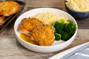 - Plate the chicken with couscous or rice and your vegetable of choice. Spoon the pan sauce over the top and serve.