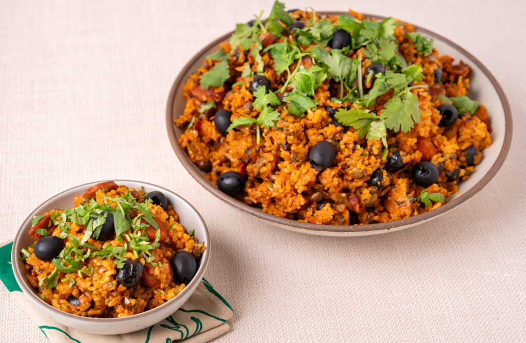 - Add the remaining chopped cilantro and fluff gently with a rice paddle to evenly incorporate the meats, olives, and gandules throughout the rice. Serve hot.