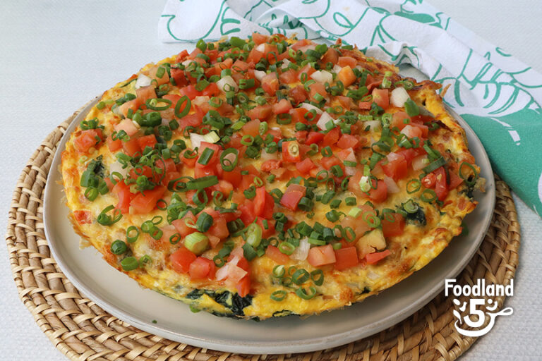- Remove from oven, let rest 2 minutes. Garnish with the reserved lomi salmon and green onions. Slice into wedges and serve family-style.
