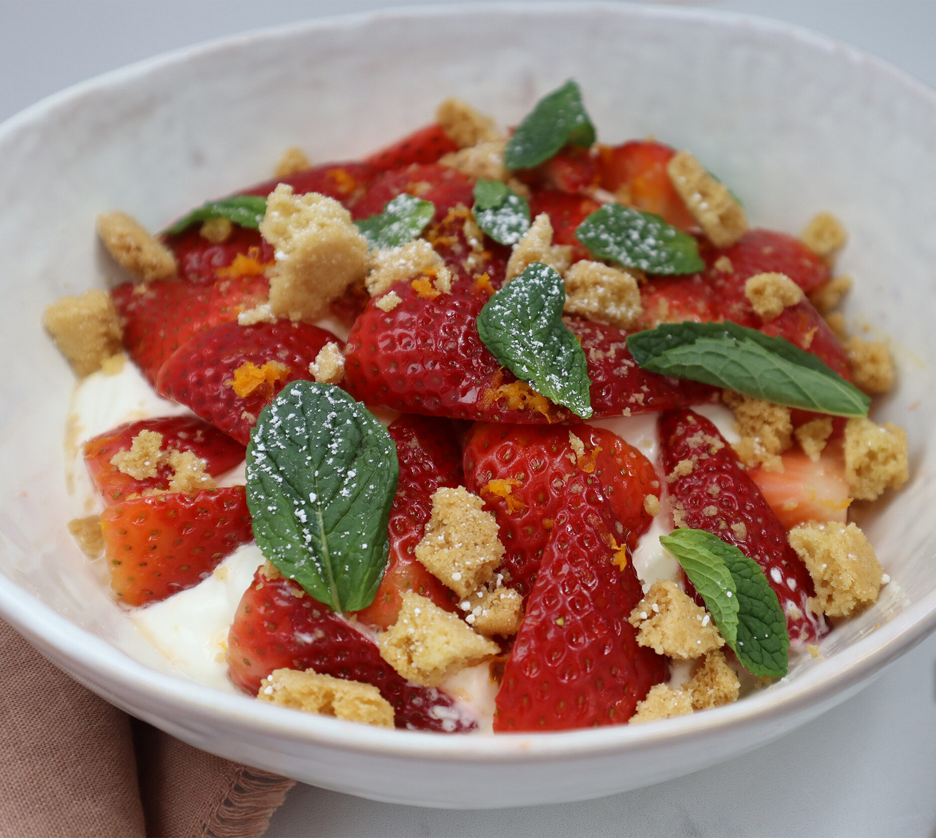 - Stir the strawberries and transfer them to a serving dish. Top with the prepared cream and garnish with optional toppings as desired.