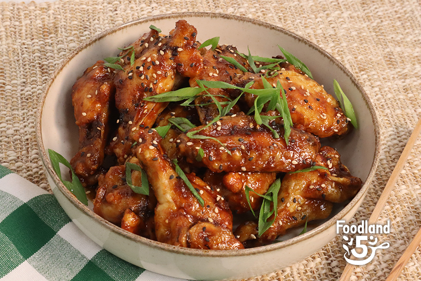 - Toss chicken wings in sauce and garnish with sesame seeds and green onions.